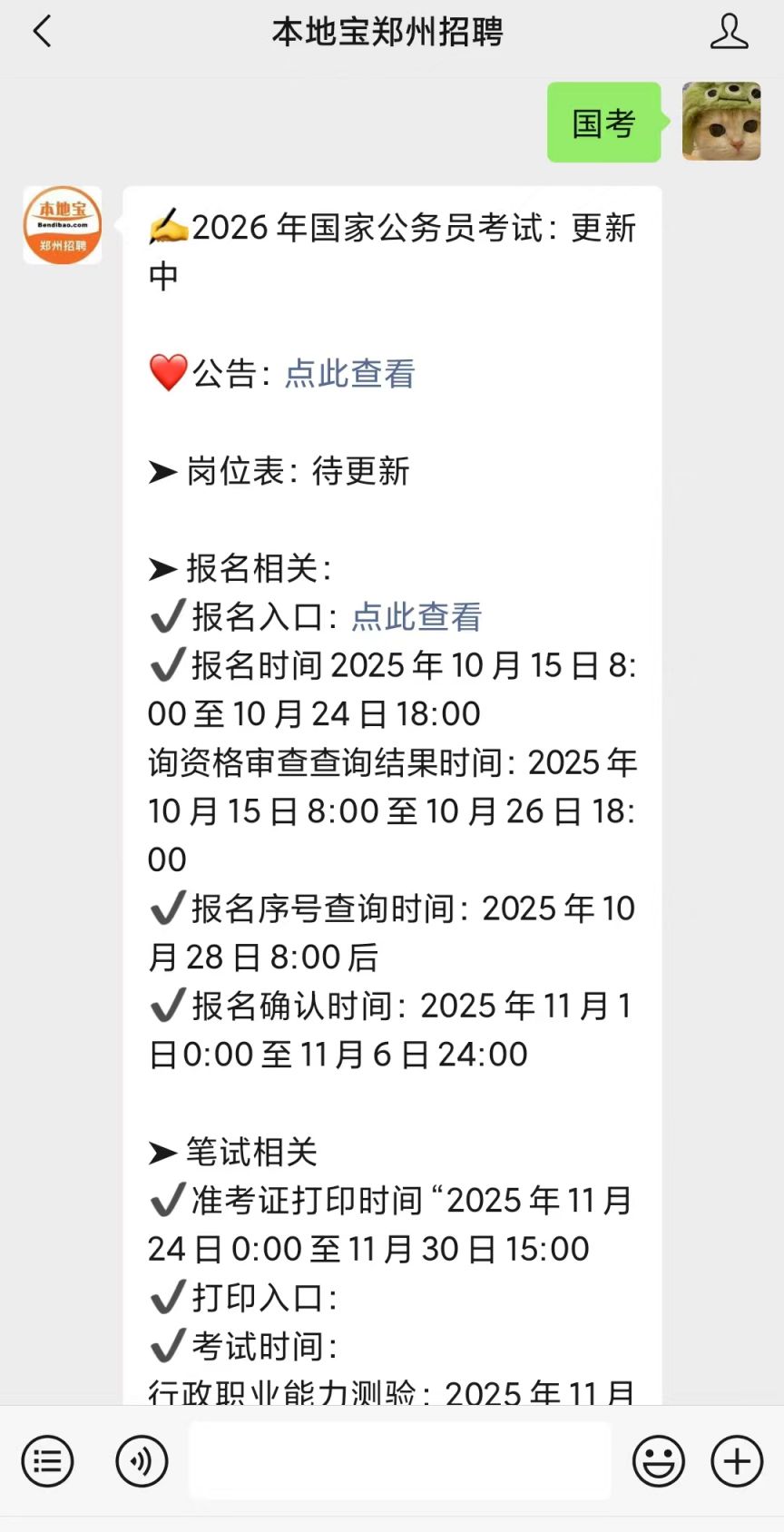 温馨提示:微信搜索公众号【本地宝郑州招聘】 ,关注后回复【国考】可获取2026年国考公告/岗位表、报名时间/入口、往年进面分数、缴费及准考证打印信息(持续更新)