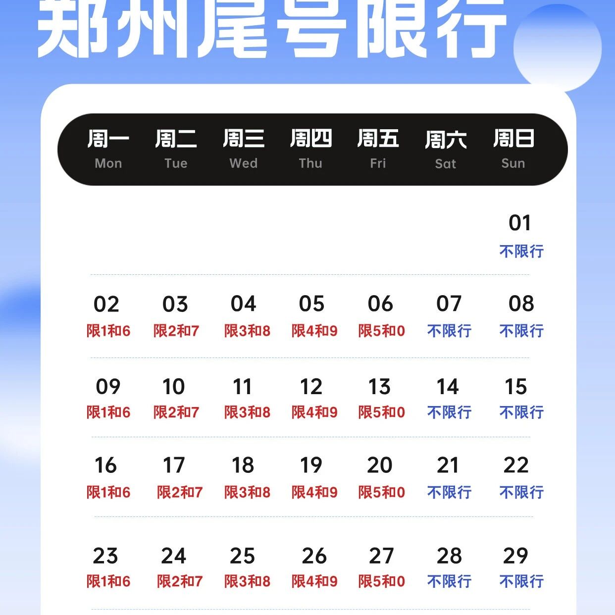 2026年3月郑州限行尾号日历