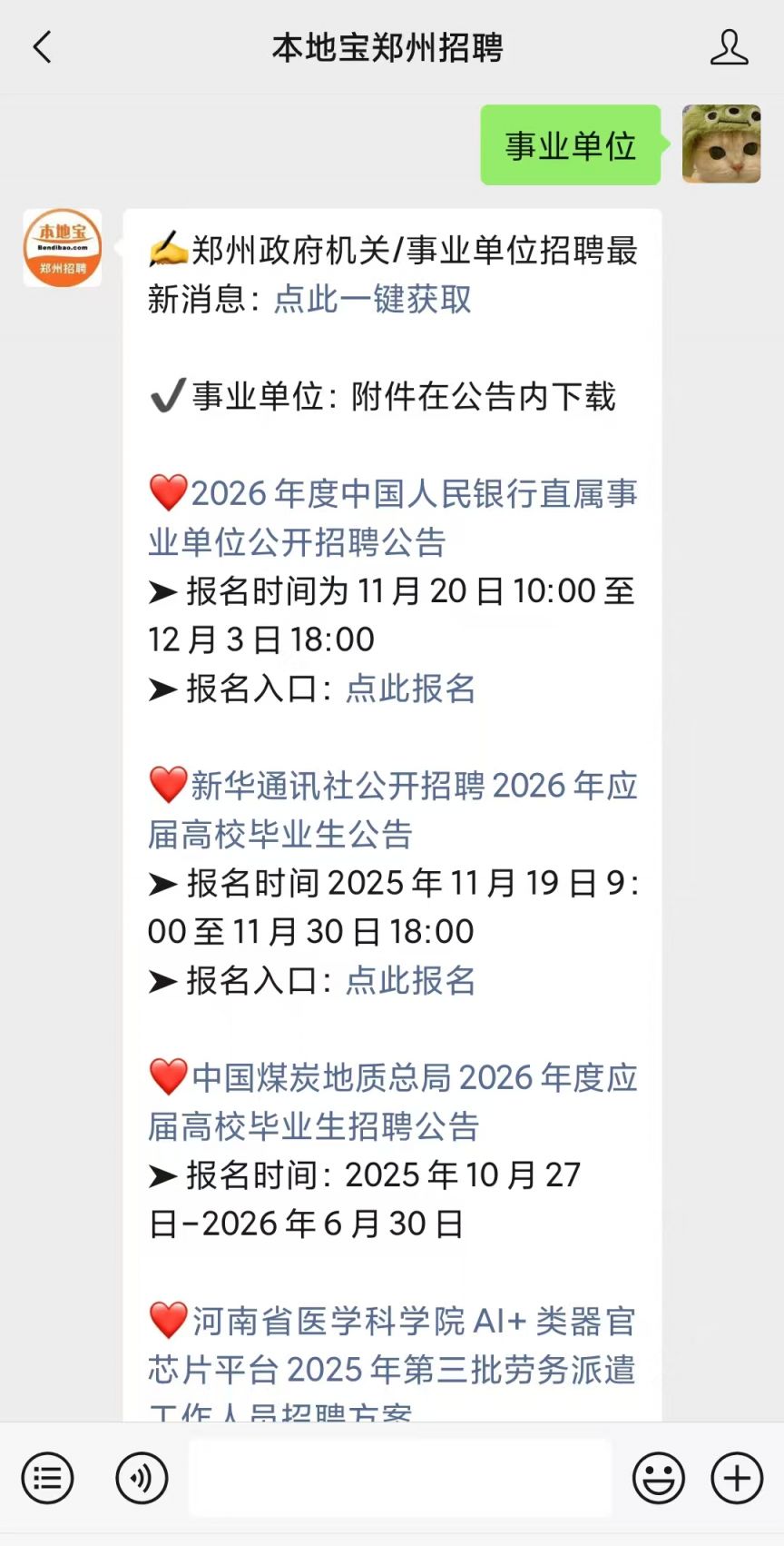 温馨提示:扫描上方二维码【本地宝郑州招聘】 ,关注后回复【事业单位】可获取郑州事业单位招聘最新信息,包括线上报名入口、查看附件、有编制岗位等。